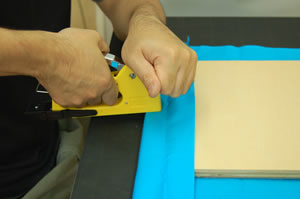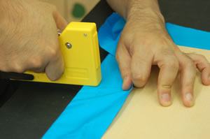 布の1辺を折り曲げ中心をガンタッカで留めます。