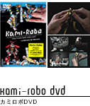 1977年。ロボットアニメに刺激されたひとりの少年が空き箱と針金でロボットを作り始めました。これが、カミロボの起源です。彼、安居智博が、プラモデルではなく、わざわざ手作りの紙ロボットを選んだ理由は、意外にも「貧乏」ではありません。「プラスチックでは、ヒト特有のやわらかい動きが表現できない」というこだわりが、彼に紙を選ばせたのです。なかなかあなどれない小学生です。少年はやがてプロレスの魅力と出会い、ロボットをレスラーとして戦わせるカミロボ遊びを生み出しました。ここまでは、よくある話かもしれません。小学生の頃、どのクラスにも、ひとりくらいこんな男の子がいたものです。でも彼がすごかったのは、この遊びをオトナになってもずーっと、やめなかったこと。誰かに見せるわけでもなく、どこかで発表するわけでもなく、27年間、彼はひとり、黙々と遊び続けたのです。 |